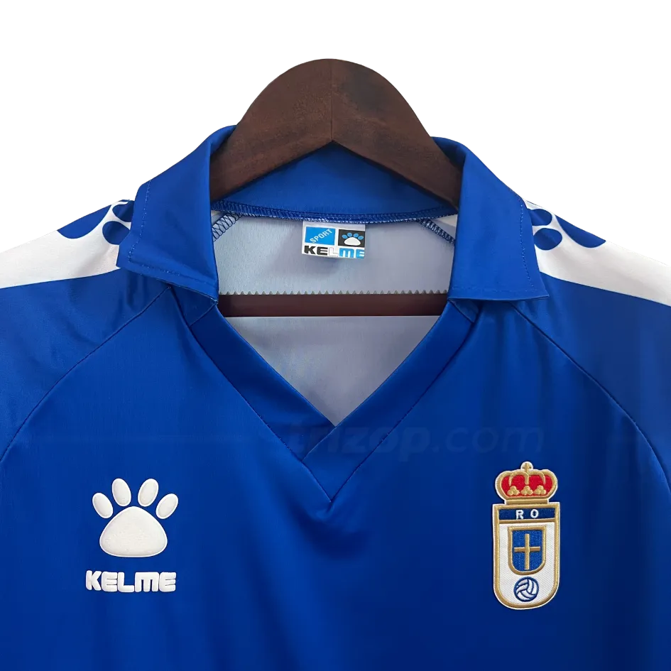 Camiseta azul estilo polo titular retro Real Oviedo de la temporada 1990/91. El tejido mantiene la frescura tanto si estás animando en las gradas como si estás jugando sobre el campo.