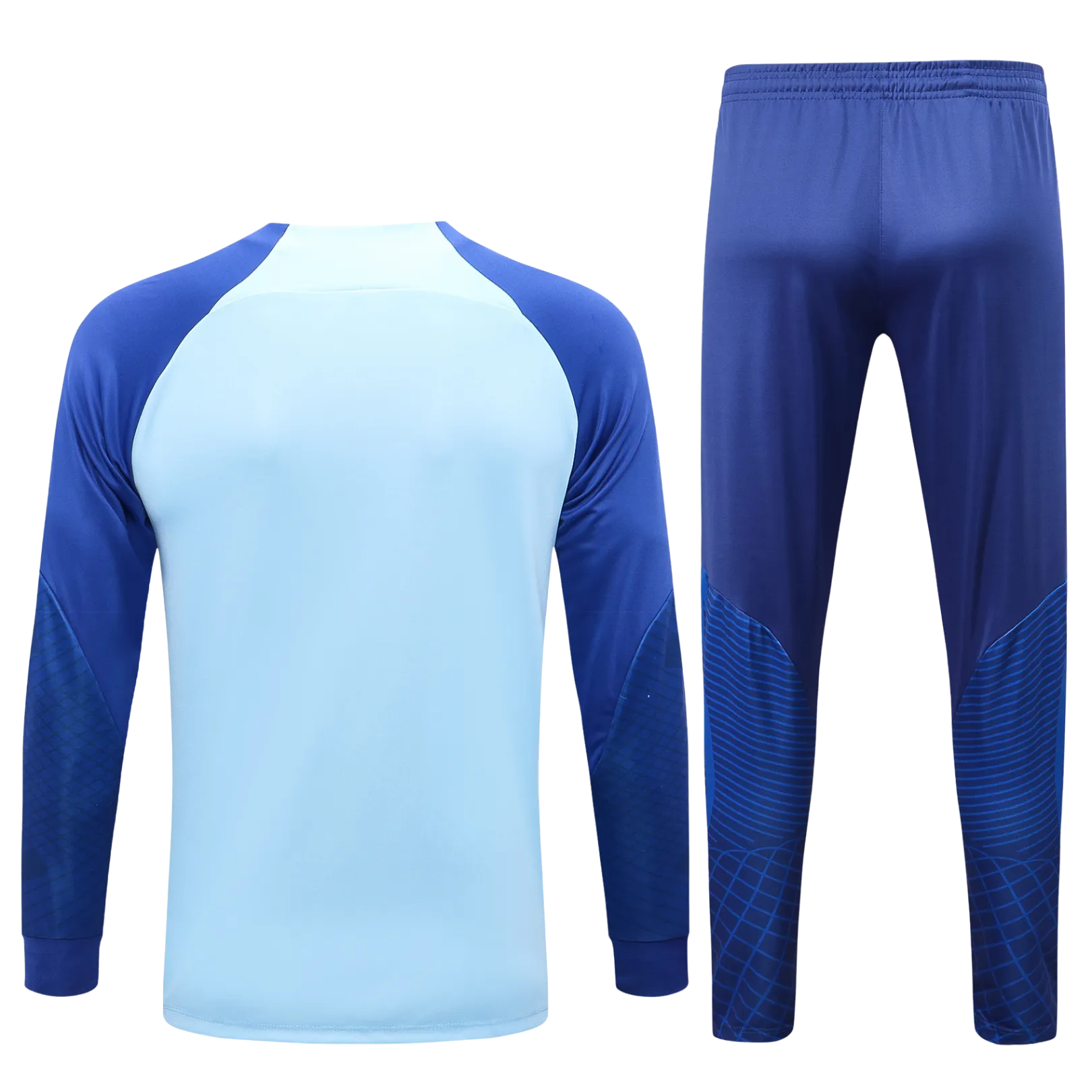 Este conjunto de dos piezas del equipo colchonero que está compuesto por una exclusiva chaqueta y un pantalón largo que se ha confeccionado en tejido resistente y cálido, que también expulsa el sudor de la piel.