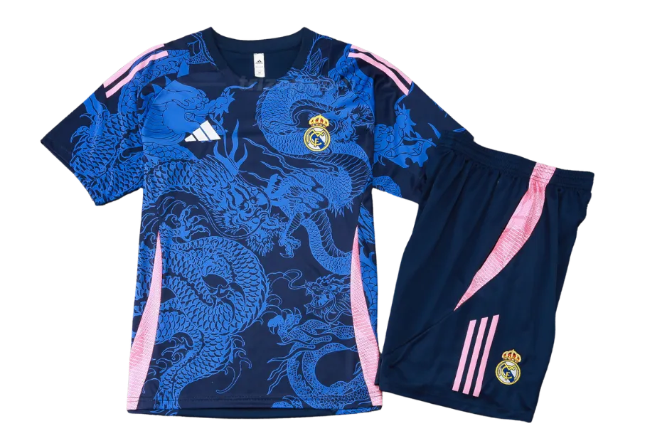 Este nuevo conjunto dragón azul de entrenamiento del Real Madrid 2024/25 ofrece un diseño de ajuste entallado que muestra a todo el mundo a quién apoyas de una manera llamativa. El tejido altamente transpirable capilariza el sudor para mantener la frescura cuando el partido se intensifica.