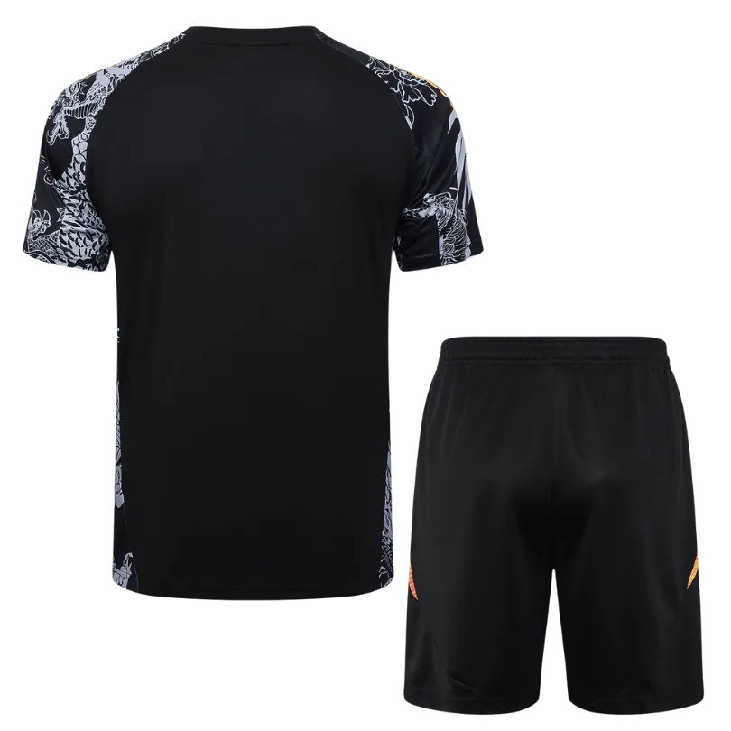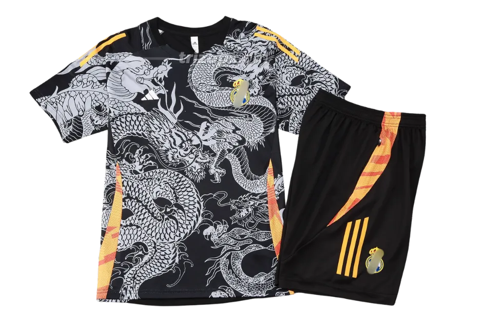 Este nuevo conjunto dragón negro de entrenamiento del Real Madrid para la 2024/25 ofrece un diseño de ajuste entallado que muestra a todo el mundo a quién apoyas de una manera llamativa. El tejido altamente transpirable capilariza el sudor para mantener la frescura cuando el partido se intensifica.