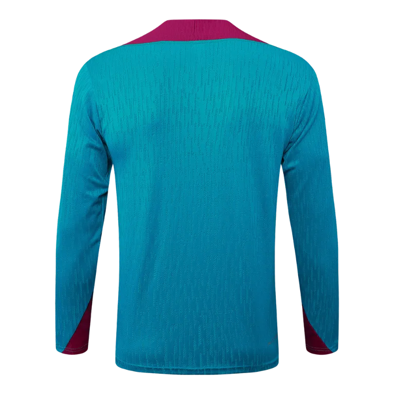 La nueva sudadera turquesa versión jugador del PSG 2024/25 está diseñada para ofrecerte velocidad en el terreno de juego. El diseño de secado rápido integra un tejido elástico y transpirabilidad estratégica para que mantengas la concentración durante el entrenamiento. Las aberturas invisibles para los pulgares permiten que las mangas se mantengan en su sitio mientras te mueves y permanecen escondidas cuando no se usan.